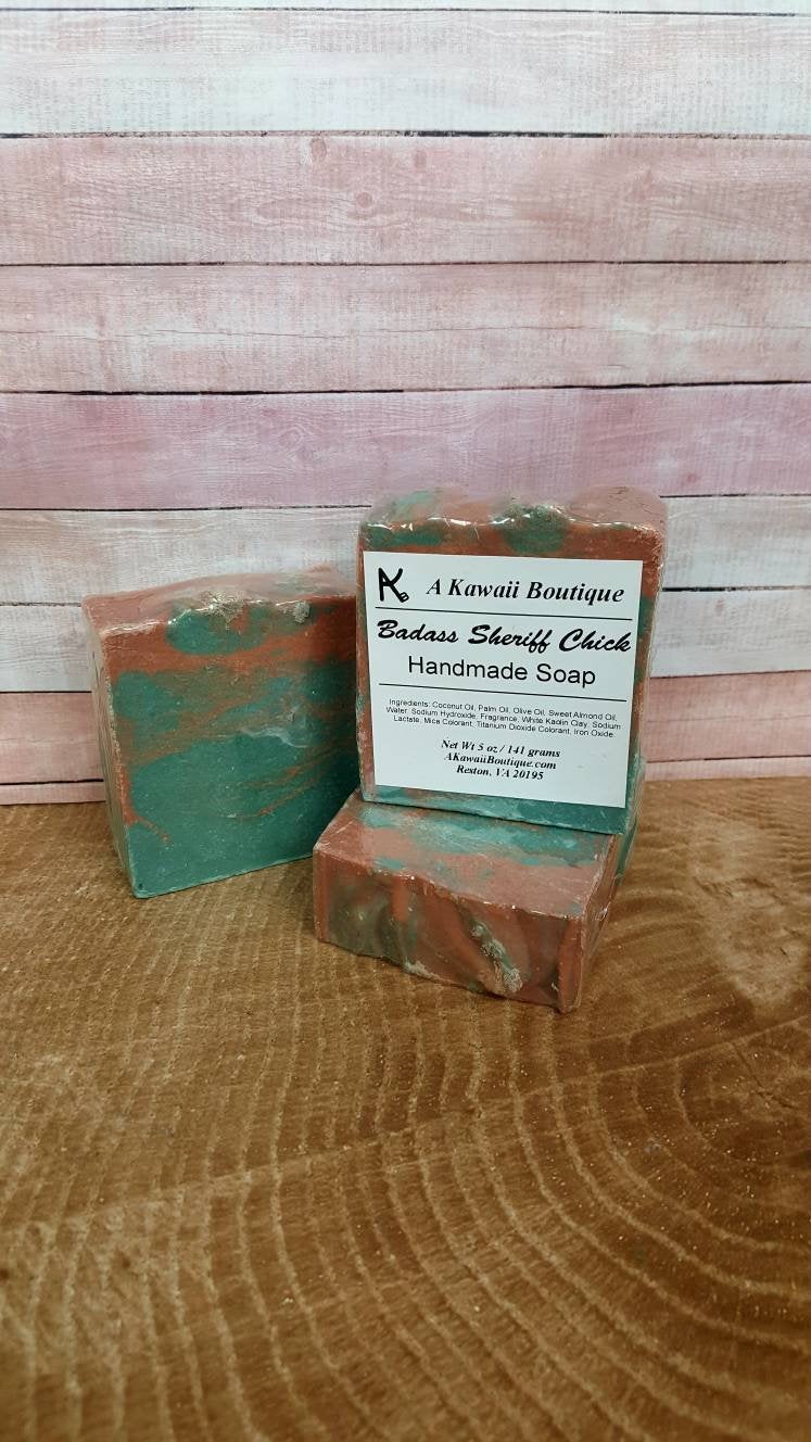 Badass Sheriff Chick is a lovely blend of sandalwood, bergamot, royal honey, mint, golden amber, cedar, pine, suede, clean lavender, geranium, cedarwood oak wood tonalities, effervescence, orange lime, and juicy berries. This is shows off our tough sheriff mom's more masculine side, as well as a fruity/floral for her feminine side.