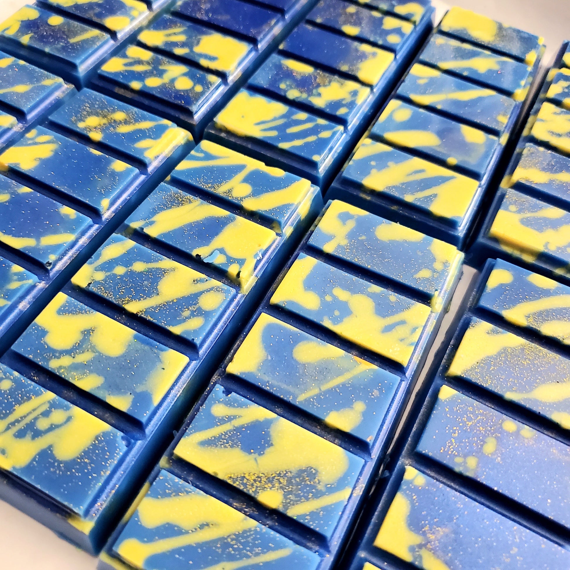 Each of these bars are in between 1.5oz to 2.3oz and is made from a blend of soywax and paraffin wax.