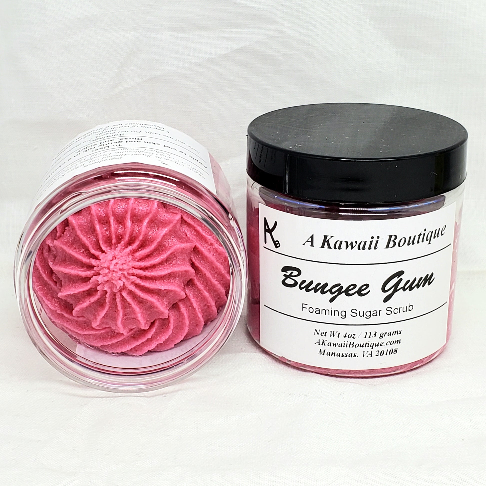 Each foaming sugar scrub is labeled at 4 ounces (but sometimes weighs up to 4.5) and comes shrink wrapped in the jar!