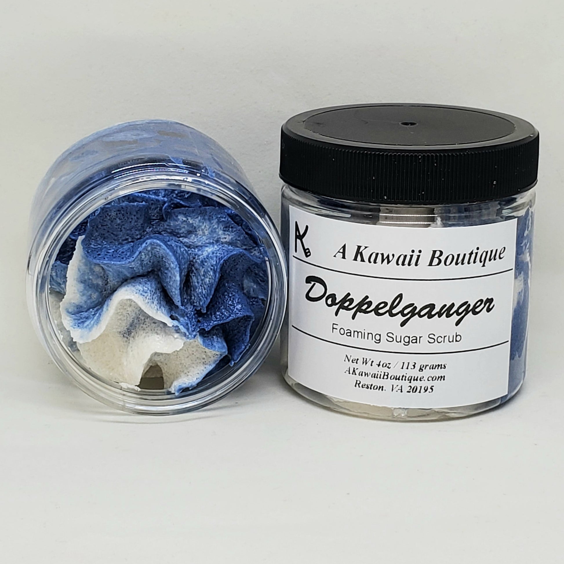 Each foaming sugar scrub is labeled at 4 ounces (but sometimes weighs up to 4.5) with a little soap embed on top and comes shrink wrapped in the jar.