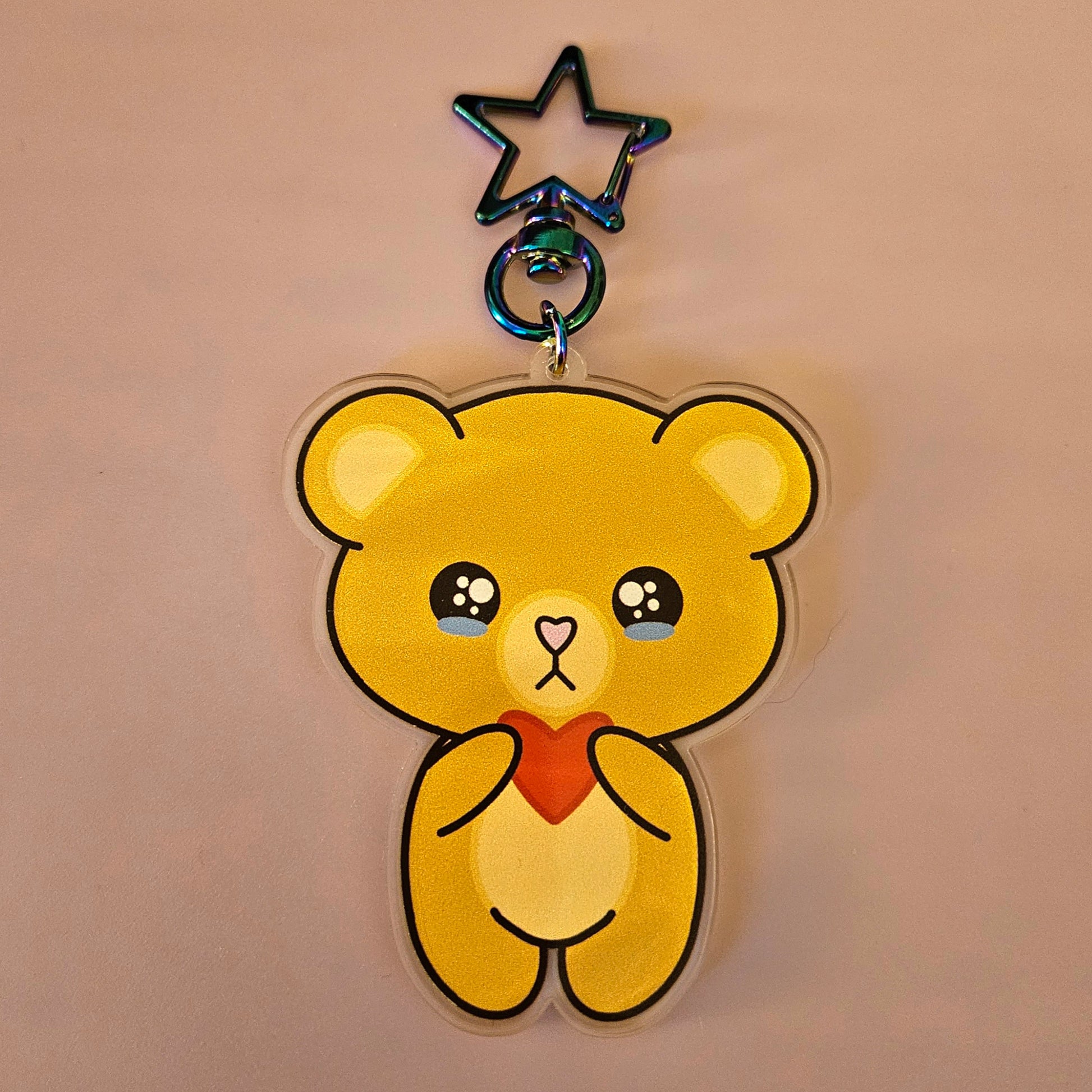 These keychains are 2.5" big at the biggest point (not including the chain). They are double-sided clear acrylic with white print and gloss on the back!