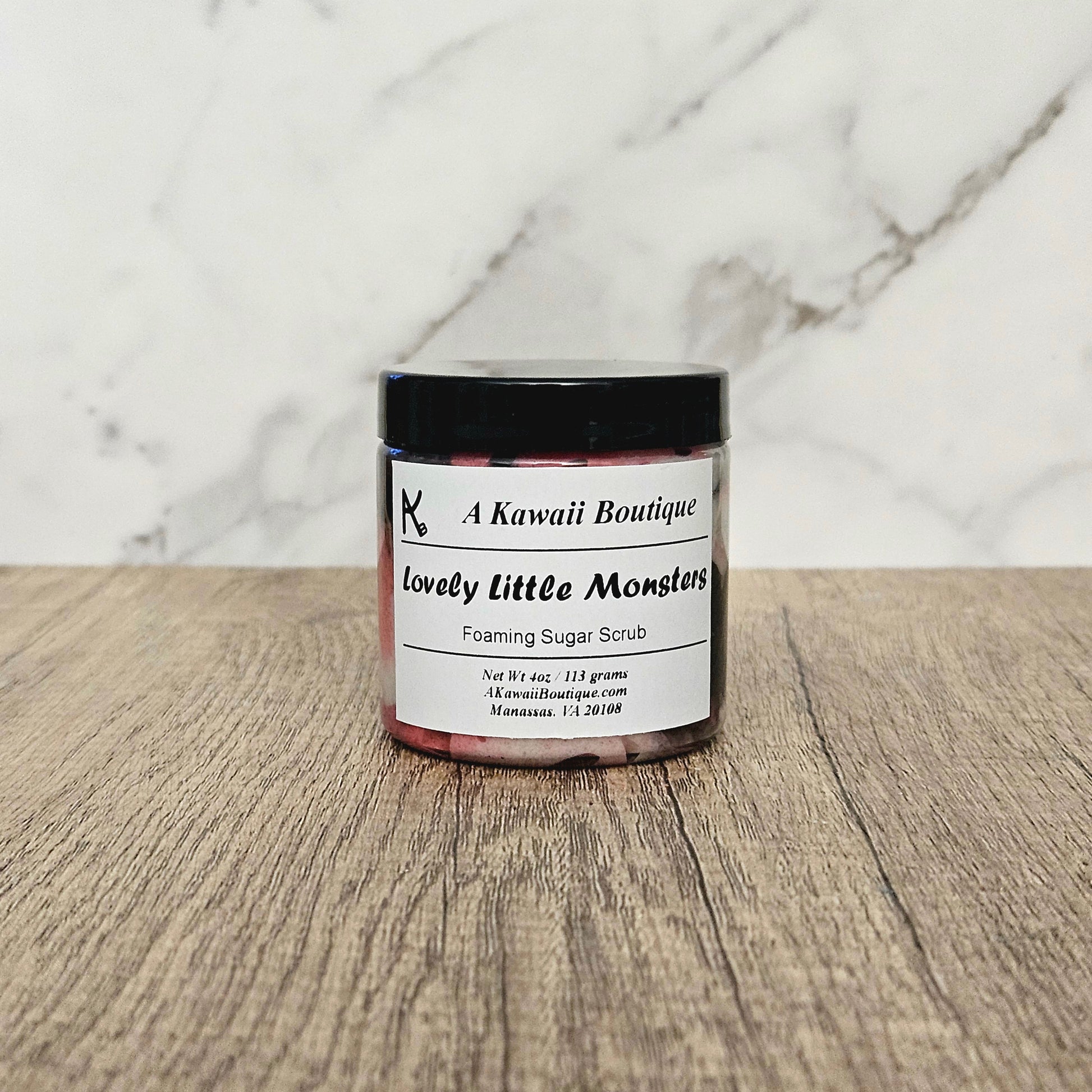 Each foaming sugar scrub is labeled at 4 ounces (but sometimes weighs up to 4.5) and comes shrink wrapped in the jar.
