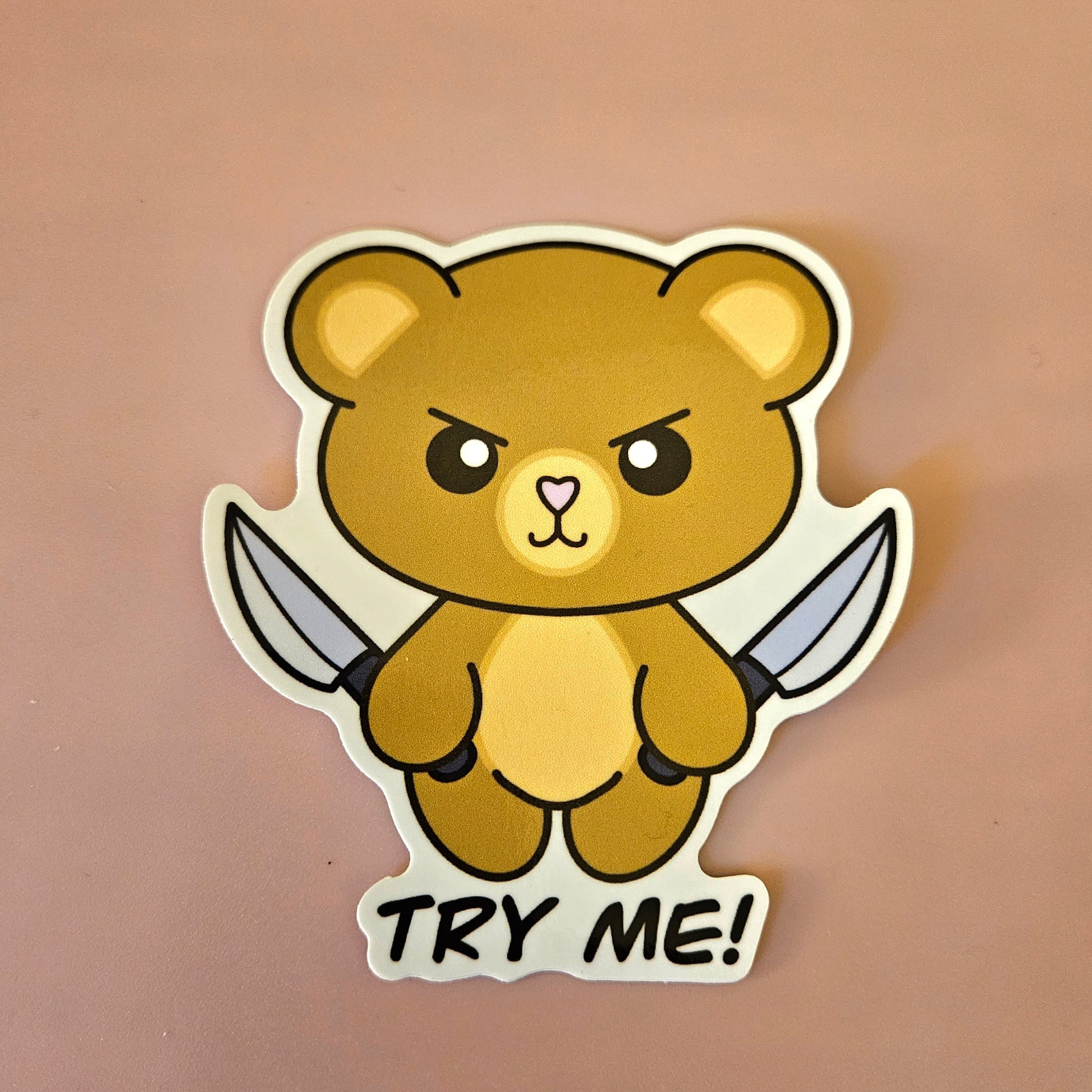Try Me Bear! This vinyl sticker is heavy duty waterproof! It is perfect for water bottles, notebooks, laptop, cases, etc!
