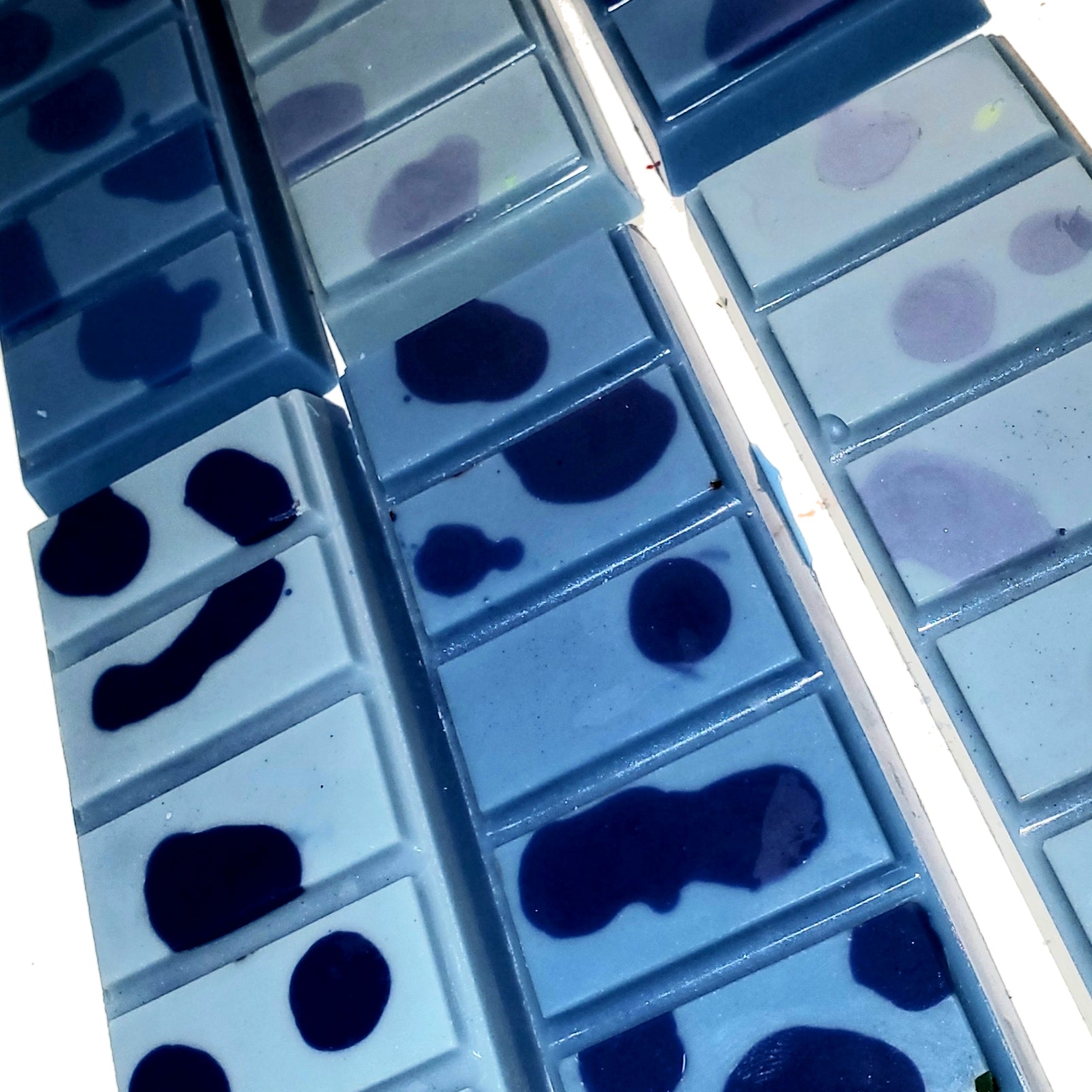 Each of these bars are in between 1.5oz to 2.3oz and is made from a blend of soywax and paraffin wax.